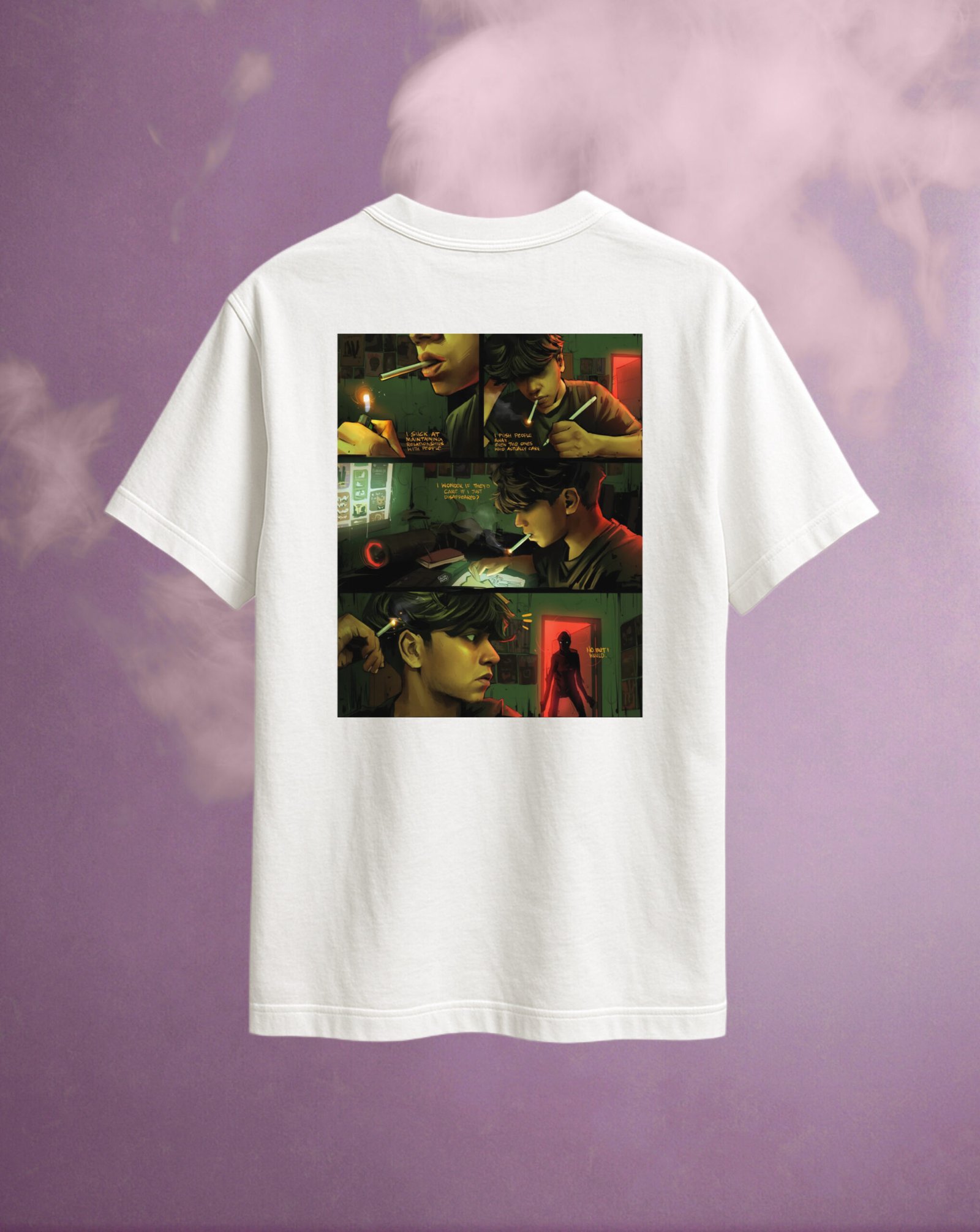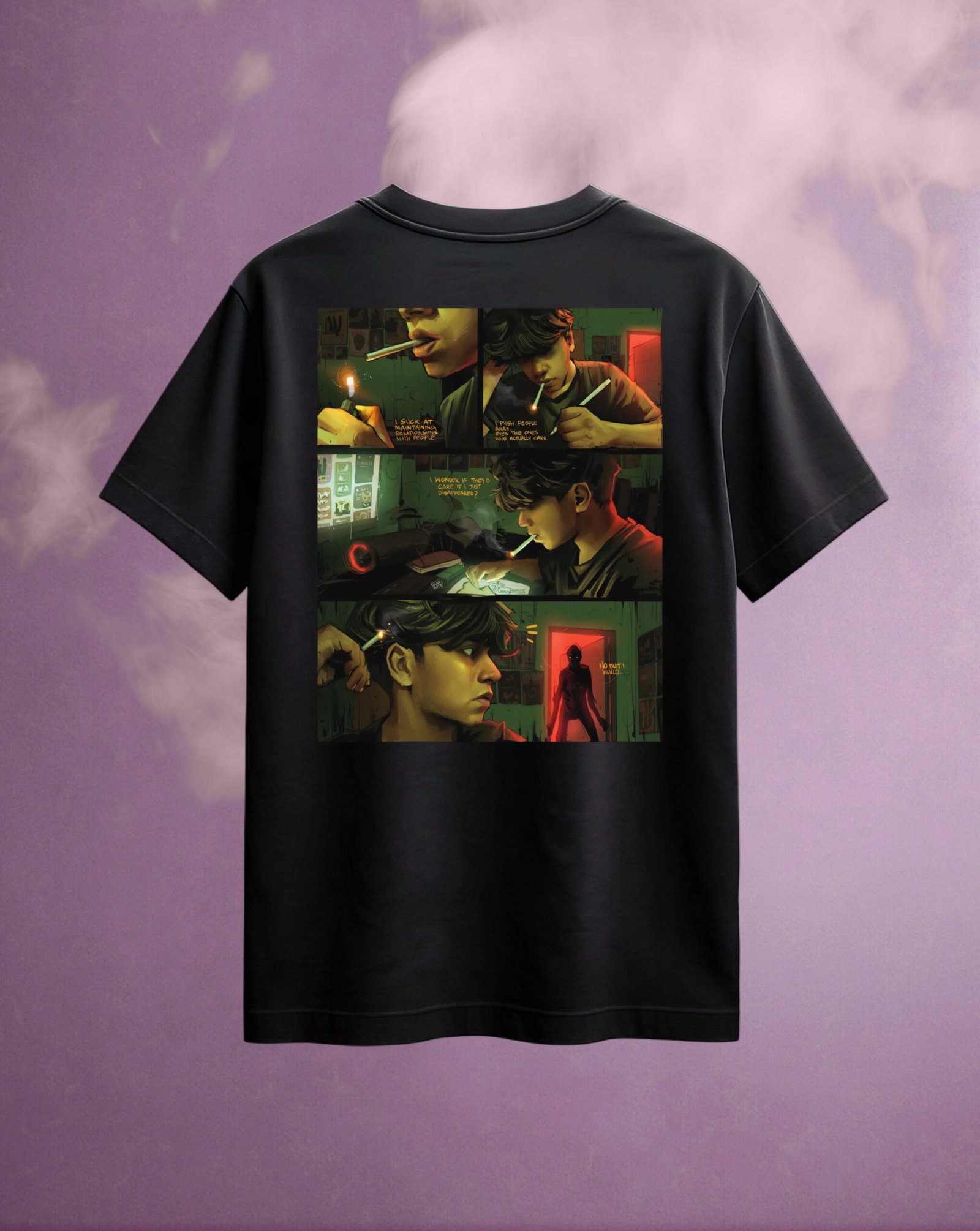 A bold comic-style artwork that captures a moody, cinematic scene with striking neon tones and storytelling details. Perfect for those who love expressive, edgy streetwear. Available in Regular and Oversized fits.